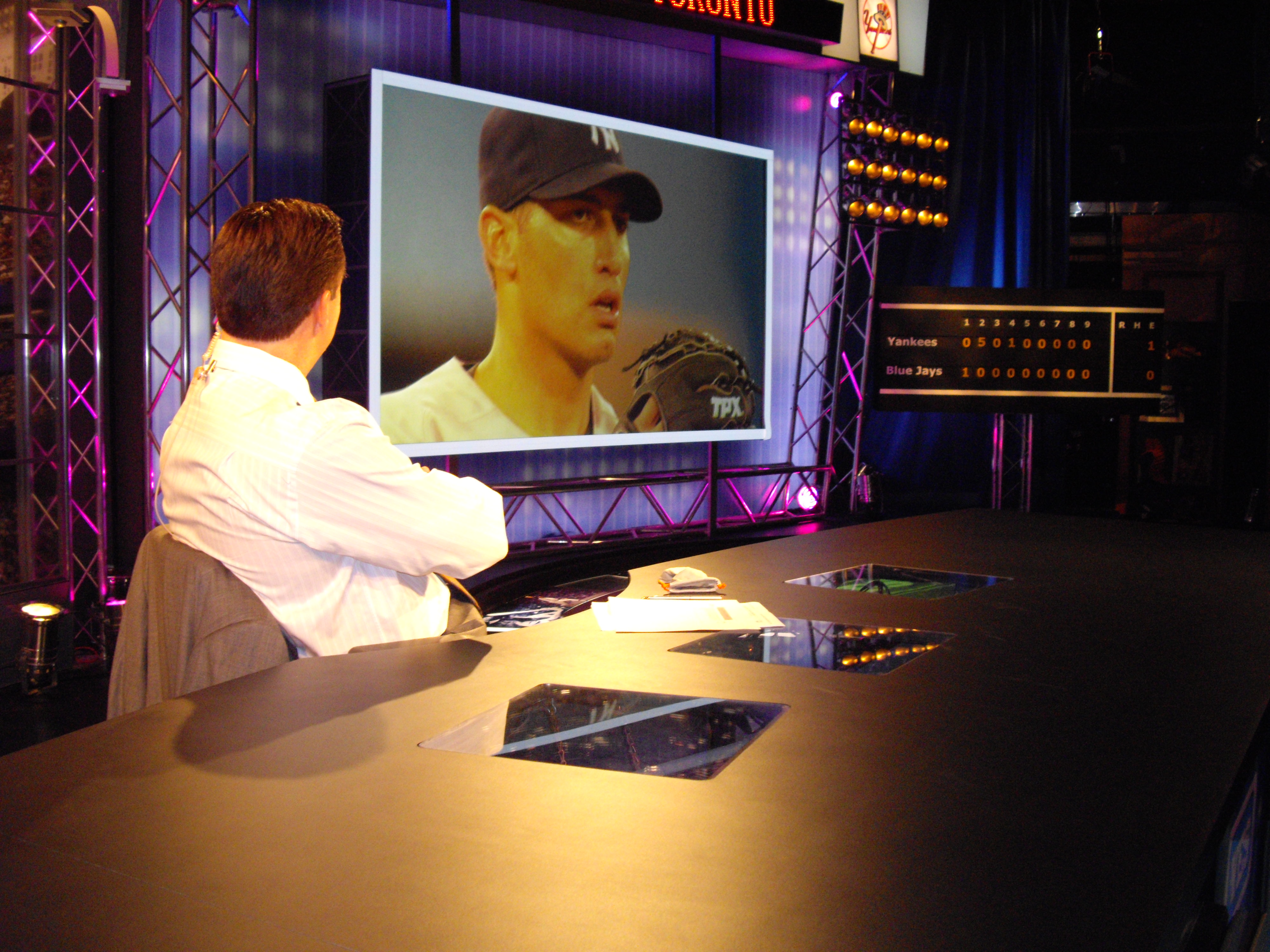 Questions of the Night  Answers to a few of your questions…I am not lonely, even if I look like it, because I have Chris, Paul, George, Terry and Quags with me in the studio.  I will introduce you to them in upcoming Blobs…either Chris or Paul, and occasionally Terry, operate the manual scoreboard…and now that I know the “umpires” behind the plate in Toronto have been other places, they just seem like attention seekers, no?  I mean, if they’ve already been on SportsCenter, can you imagine how rabid they are for more attention?  Why, it’s like giving a kid all the candy in my office!!!…Or how about the people in stadiums who always know when the camera comes on (like on a closeup of a batter and they’re behind them in the stands) and they’re on their cellphones and stand up, waving like idiots?!  I hope no Blobbers do that…if you do, sorry if I just dogged you, but that’s kinda lame, isn’t it?  Just one man’s opinion…