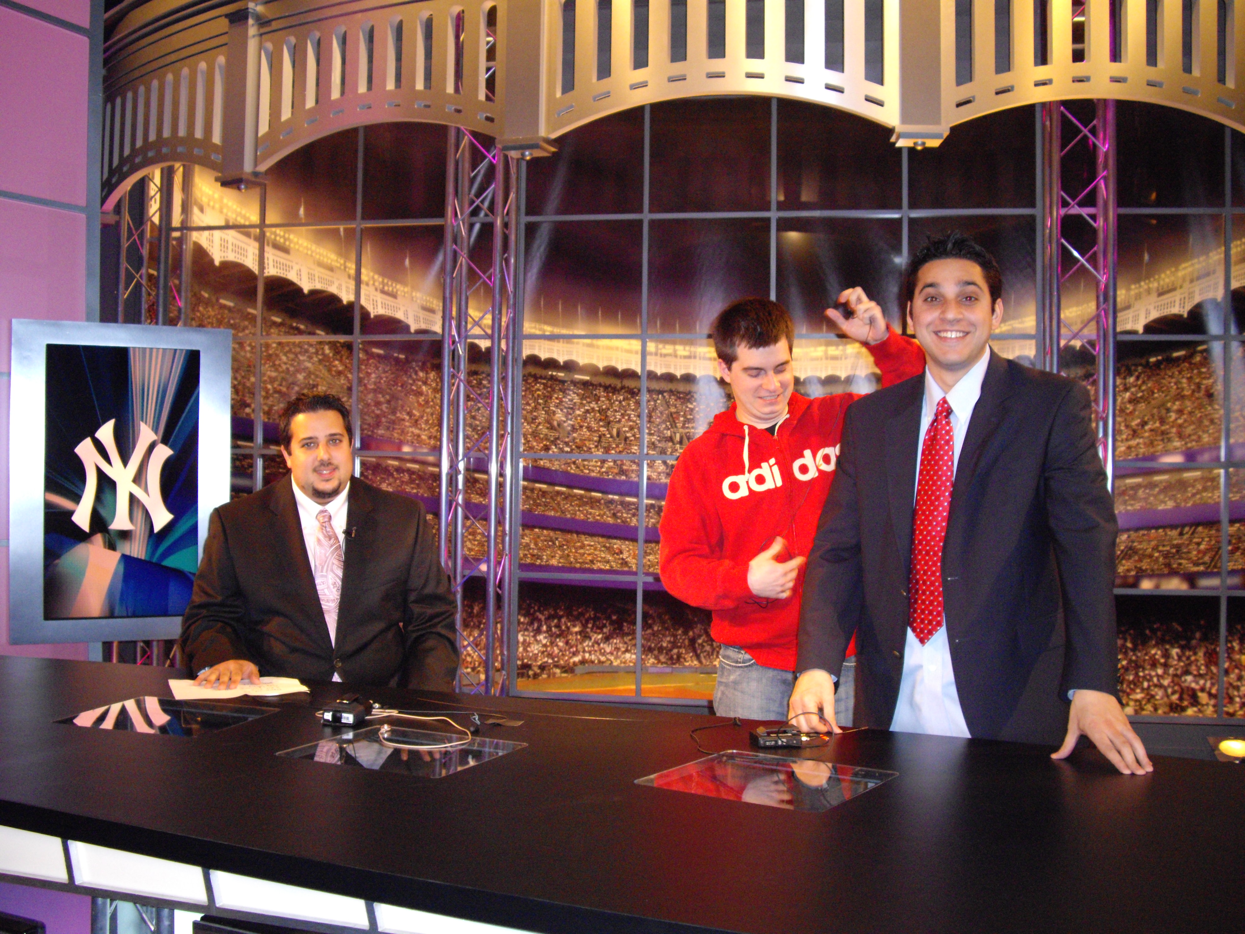 2nd Blob 001.jpgI took this next picture right after I got done doing the update…Web Wunderkind Joe Auriemma (seated on left) and writer/web sensation Glenn Giangrande (standing on right) prepare to tape Pinstripe Weekly, their exclusive web segment on yesnetwork.com.  In the middle is Jimmy on audio, either hooking up Glenn’s mike and earpiece, or about to wrap an audio cable around Glenn’s neck.  Given the fact that I just saw Glenn in the hallway, I guess Jimmy didn’t do it…but that doesn’t mean he wasn’t thinking it.  Huh?  Wait, not with Glenn…GG’s good people.