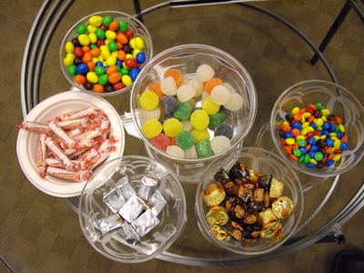 So to answer one of Jeanne’s questions…What candy is on the table?  Well, note the NEW additions…Smarties on the left…the mouthwatering mix of regular and dark chocolate peanut butter cups on the right…and, well hey there?!  What are those delicious delights in the silver wrappers?